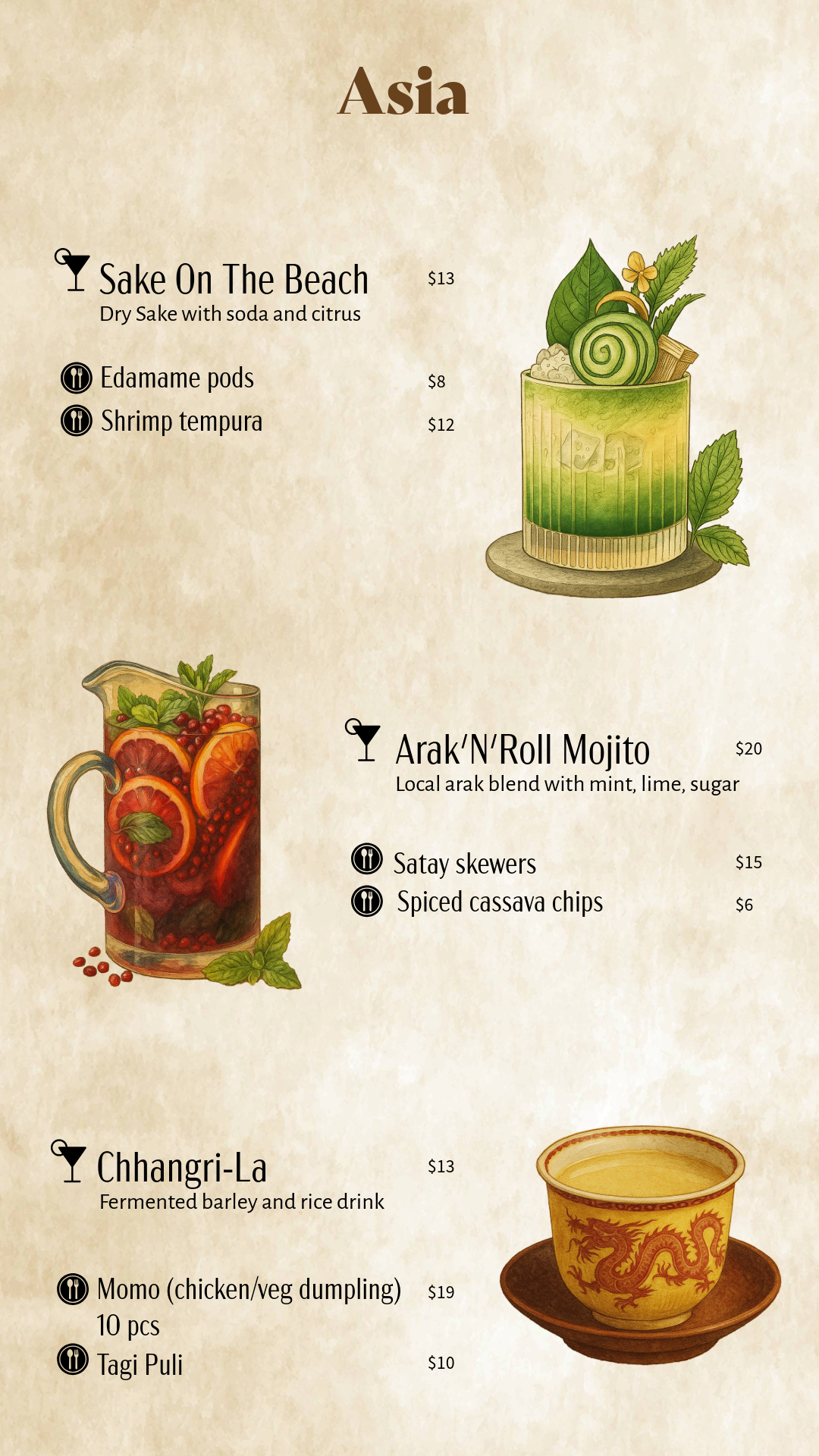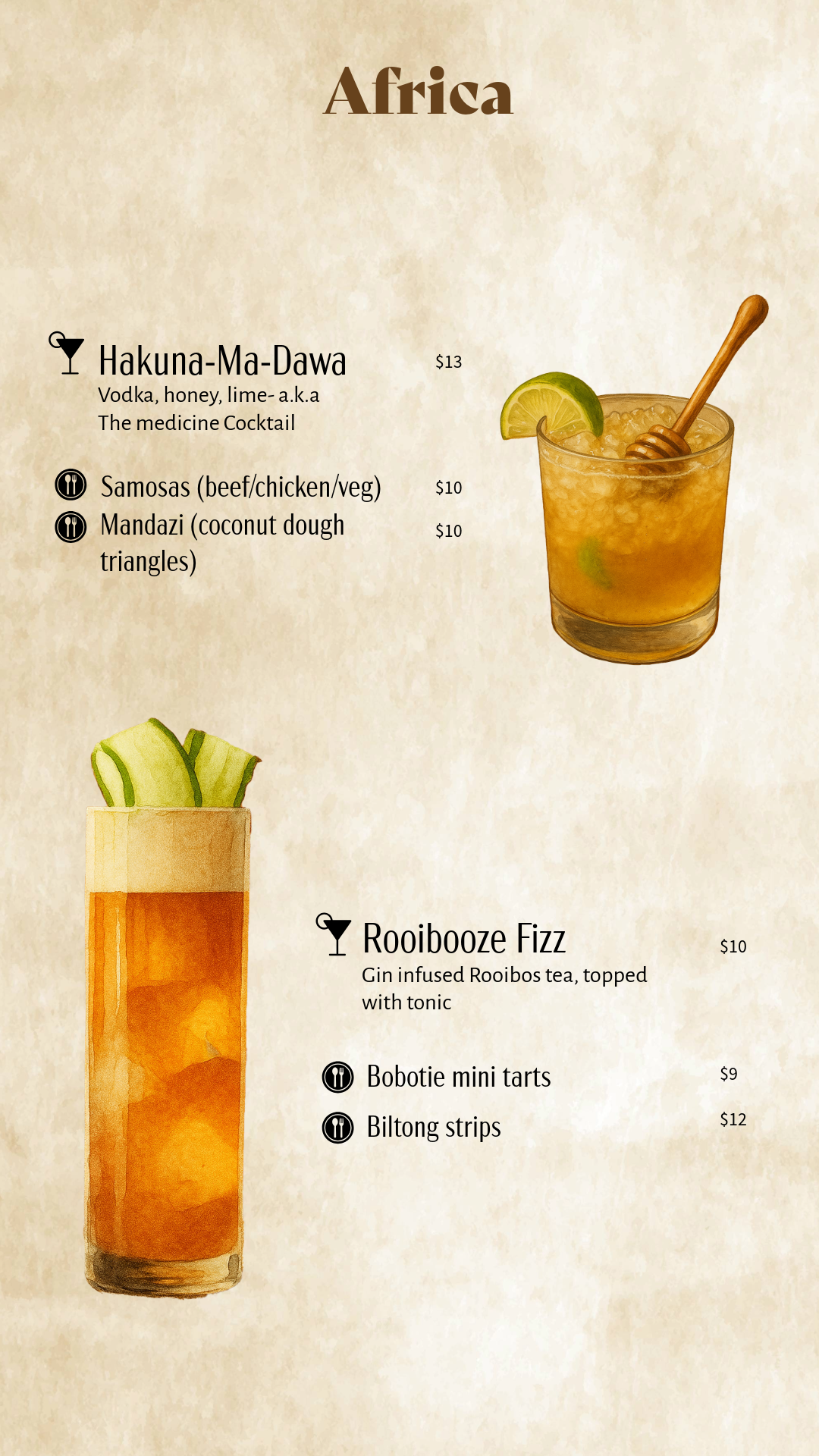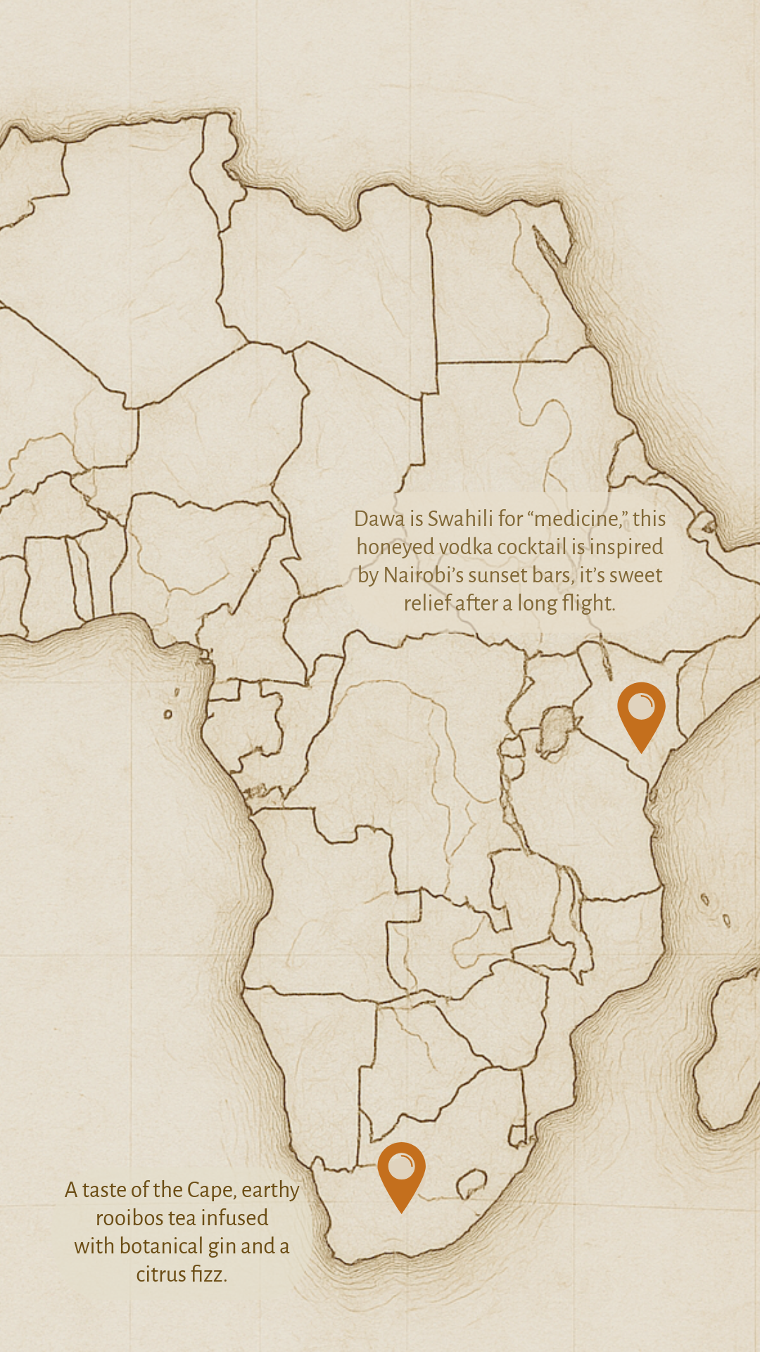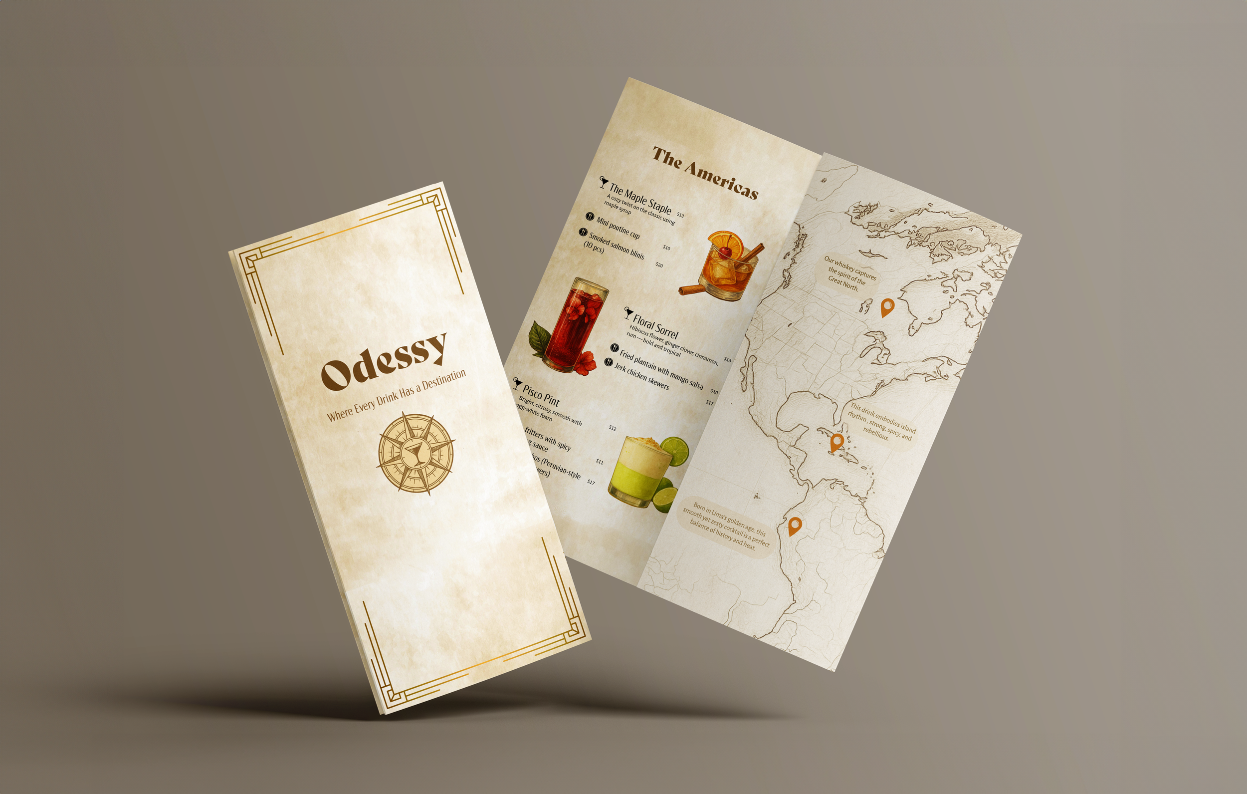 The final execution comes to life through a thoughtfully designed menu system and visual identity. Each menu section highlights a different region, such as the Americas, Europe, and Africa and its signature drinks with local bites. The storytelling elements like maps and cultural notes layer the design approach & reinforces the narrative, turning each selection into a journey.